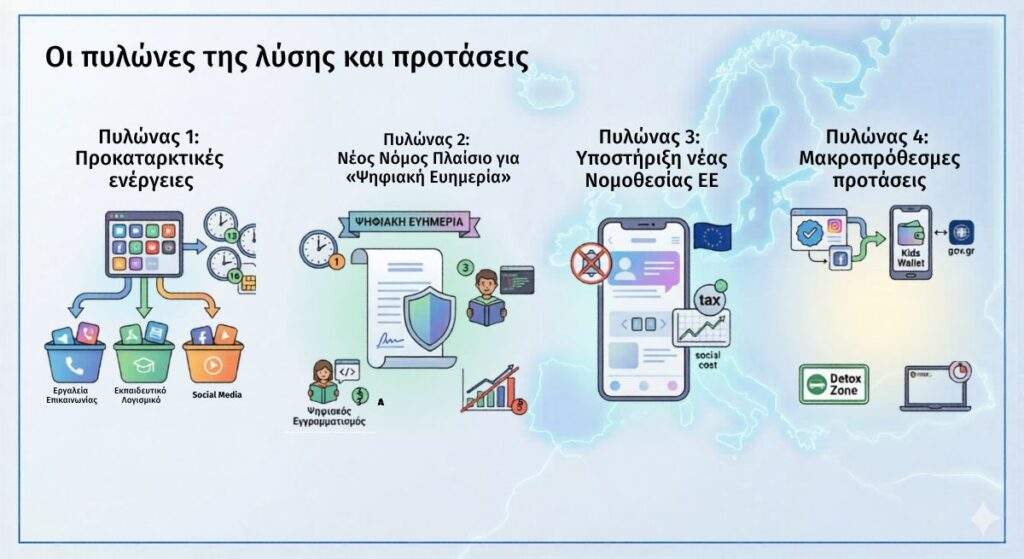 Να σημειωθεί εδώ ότι δεν μπορούμε να εξασφαλίσουμε ότι το Digital Well being θα μπορεί μακροπρόθεσμα να επιτευχθεί νομοθετώντας μόνο στη χώρα μας. Πρέπει να συμβάλουμε ενεργά ως χώρα στη δημιουργία Ευρωπαϊκής Νομοθεσίας για διάφορα πολύ σημαντικά σχετικά θέματα. Γι’ αυτό δύο από τους τέσσερις πυλώνες της προτεινόμενης λύσης αφορούν Ελληνική και Ευρωπαϊκή Νομοθεσία ξεχωριστά.