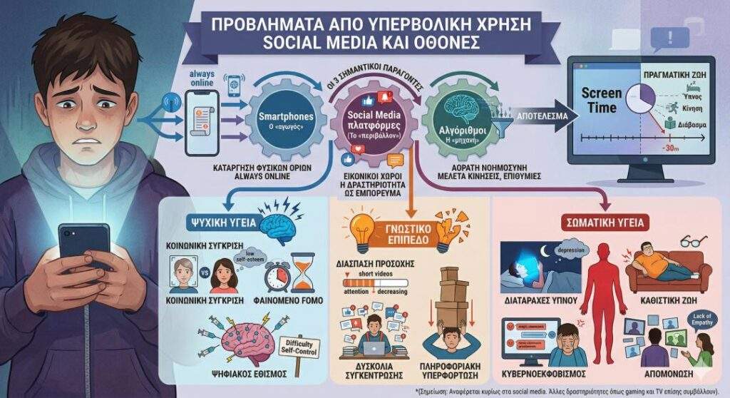 Οι επιπτώσεις της υπερβολικής έκθεσης των νέων κάτω των 16 ετών στον ψηφιακό κόσμο είναι πολυδιάστατες, με τις έρευνες να εστιάζουν πρωτίστως στην επιδείνωση της ψυχικής υγείας. Η συνεχής κοινωνική σύγκριση με φιλτραρισμένες ψηφιακές εικόνες καλλιεργεί αισθήματα ανεπάρκειας και χαμηλή αυτοεκτίμηση, ενώ το φαινόμενο FOMO δημιουργεί ένα μόνιμο καθεστώς άγχους. Ο ψηφιακός εθισμός εμφανίζεται ως μια πραγματική απειλή, καθώς οι μηχανισμοί επιβράβευσης των κοινωνικών δικτύων ενεργοποιούν τα ίδια κέντρα του εγκεφάλου με τις εξαρτησιογόνες ουσίες, καθιστώντας τον αυτοέλεγχο των εφήβων εξαιρετικά δύσκολο.